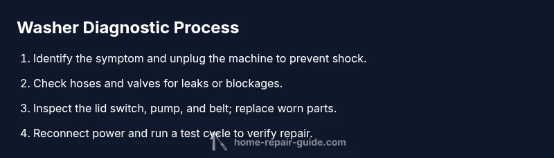 Washer problems show up in a handful of predictable forms. You may notice water on the floor after a cycle, clothes remaining damp, or a unit that won’t spin or drain. According to Home Repair Guide, these symptoms usually point to a small set of durable culprits rather than a labyrinth of root causes. By focusing on the most common failure points, you can diagnose the problem with a few targeted checks and avoid unnecessary disassembly. Typical signs include not spinning, not draining, loud banging or grinding, slow filling, leaks around hoses, and excessive vibration. While every model has its quirks, most issues fall into a few categories: drive components like belts, lid switches, and support springs; drainage components such as pumps and hoses; and control components including timers or sensors. Washer repair is about tracing symptoms to a practical cause and applying a safe fix that restores operation without compromising safety.