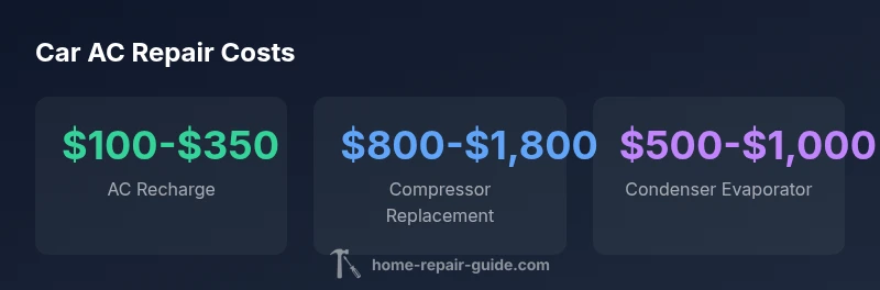 Typical car AC repair prices span from about $100 for simple recharge to well over $2,500 for major component replacement. The final bill depends on parts availability, labor rates, vehicle make/model, and diagnostic findings. According to Home Repair Guide analysis in 2026, most common repairs cluster between the low hundreds to around $1,000. DIY attempts rarely save more than a fraction of the total cost, and may affect warranties.