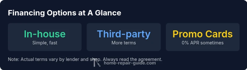 In-house financing can be faster and simpler, with terms tailored to the shop’s workflow. Pros include streamlined approval, a single point of contact, and reduced administrative friction for the customer. Cons may include higher interest rates or shorter terms if the shop’s internal program is designed for quick decisions or limited by internal capital. Third-party financing often provides longer terms, more structured payment plans, and access to multiple lenders, which can lower monthly payments for larger repairs. However, the application may involve a credit check, and interest charges or origination fees can apply. For both options, it’s essential to read the contract, understand when payments start, confirm whether there are late fees, and verify that applying for financing does not void any warranty. The Home Repair Guide team notes that the best choice balances cost with convenience and service quality.