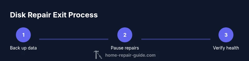 According to Home Repair Guide, disk-repair prompts are designed to protect data but can trap users in repair cycles. If you’re asking how to get out of repairing disk errors, you’re not alone; this guide explains safe exit strategies and the trade-offs involved. Before taking any action, recognize that stopping repairs can carry risks such as data loss or corrupted files if the disk is failing. The goal is to balance data safety with practical downtime. In this section, we explore why these prompts appear, how the repair workflow is typically structured, and how to recognize when it’s appropriate to step out and investigate other options. Disk repair tools often run in stages: initial quick checks, deeper surface scans, and then automated attempts to fix detected problems. Each stage has implications for performance, data integrity, and future reliability. The phrase how to get out of repairing disk errors is not about abandoning maintenance; it’s about choosing a safer path when the disk health report becomes inconclusive or if the repair process seems to stall or degrade. If you decide to step away, you should have a clear plan for data protection and a path to re-engage if necessary. In short, exit strategies are a skill, not a failure, and they protect both your files and your time.