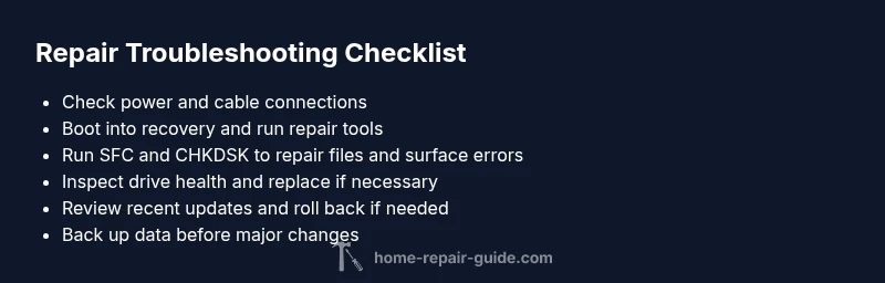 Start with the simplest checks and work toward the more complex ones. Confirm power stability and cable connections, then attempt to boot into recovery mode. Look for any error codes, and note whether the failure happens before the OS loads or during the repair scan. Run basic hardware diagnostics if possible (memory test, storage health check). Resetting to a previous restore point can help isolate whether a recent change caused the failure. If the problem persists after basic checks, escalate to tool-specific repairs (boot record repair, file system checks) and consider a clean reinstall as a last resort. Throughout, keep updates and backups current to prevent data loss.