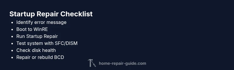 Startup Repair is a Windows feature that analyzes boot issues and attempts to fix missing or corrupt system files automatically. When it fails, you’re left staring at errors and a non-functional computer. According to Home Repair Guide, the most effective path begins with a calm, methodical approach rather than random fixes. Understanding why this repair process stalls is essential to choosing the right next steps and preventing data loss. In this guide we explore the common patterns behind why startup repair not working and outline concrete actions you can take safely. Whether you’re facing a blue screen, a loop at the spinning dots, or a reboot cycle, the root causes typically fall into a handful of categories: software corruption, malware, disk health problems, boot configuration data damage, or driver conflicts. Recognizing this pattern lets you triage quickly and preserve your data while you work toward restoration.