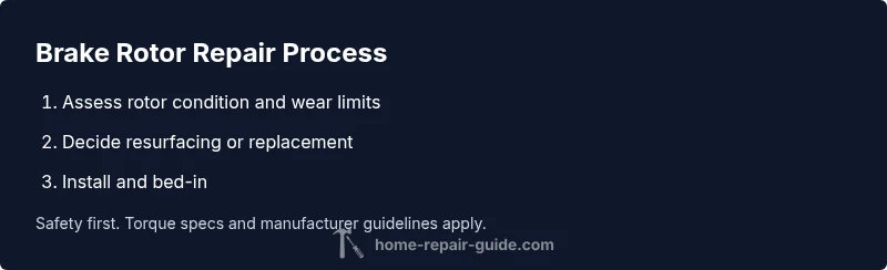 Brake rotor repair encompasses restoring a smooth, effective braking surface either by resurfacing (turning) the rotor or by replacing it when wear or damage is too extensive. The process focuses on removing imperfections, ensuring proper runout, and maintaining safe contact with the brake pads. According to Home Repair Guide, a careful assessment of rotor condition and caliper operation is essential before you begin. If the rotor is deeply scored, warped beyond tolerance, or shows cracks, replacement is the safer choice. In many cases, early inspection and maintenance prevent costly repairs later, and the decision between resurfacing and replacement hinges on material thickness and the vehicle manufacturer's specifications. This section explains how rotors wear, what qualifies as damage, and how you choose the best path for your vehicle and driving needs. Keep in mind that the safety margin depends on the entire braking system, including pads, calipers, and brake fluid.