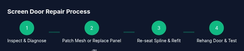 Most screen door issues fall into a few predictable categories. Torn mesh is the most common reason for a door to let insects through; misalignment can cause rubbing or sticking; loose hinges create sag and poor latching; and gaps around the frame invite drafts and moisture. Each problem has a practical fix you can do with basic tools and a little patience. This section lays out the symptoms, likely causes, and cost-effective DIY remedies so you can decide whether to patch, replace, or call for help. Home Repair Guide has found that tackling issues in this order—mesh first, then frame and hinges, then weather sealing—yields the best long-term results.
